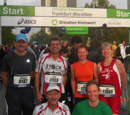 > Max Reiß in 3:00 Stunden und 10 Sekunden <Zu einem Erlebnis wurde der 27. Frankfurt Marathon für sechs Breitensportler aus dem Raum Eschenbach. Zwölf Wochen Vorbereitung wurden mit dem krönenden Abschluss in der Bankenmetropole vor 300.000 begeisterten Zuschauern belohnt. Die sehr attraktive Streck führte vom Messegelände vorbei an der Friedrich-Ebert-Anlage, Kurt-Schumacherstraße, Kennedy-Alle, Willy-Brandt Platz, durch das Bankenviertel, eine Schleife nach Höchst und wieder zurück in die Innenstadt mit Zieleinlauf in die Messehalle. Viele Bands auf der Strecke, stimmkräftige Einpeitscher des Veranstalters und begeistertes Publikum ließen auf der Strecke alle Strapazen vergessen. Eine fantastischen Leistung zeigte Max Reiß mit einer persönlichen Bestleistung von 3:00 Stunden und 10 Sekunden. Doris Mayer konnte mit 3:54 ebenfalls ihre Bestmarke unterbieten. Sehr gute sportliche Noten zeigten auch Franz Fuchs in 4:15, Inge Hanicke mit 3:58, Wolfgang Grillenbeck in 3:33 und Gerhard Stock in 3:18 Stunden. Dabei zeigten die Eschenbach eine geschlossene Gesamtleistung. Alle Eschenbacher Waren von den 15.000 Marathon-Startern unter den ersten 6000 platziert Von links: Wolfgang Grillenbeck, Gerhard Stock, Franz Fuchs, Doris Mayer, Max Reiß, Inge Hanicke