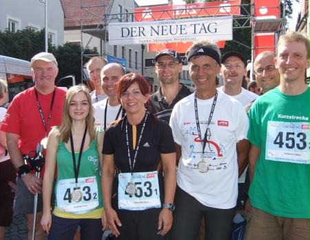 Am Sonntag dann wurde es ernst: Thomas Lohner startete in Regensburg unter 1000 Läufern auf die 42,2 Kilometer. Die hochsommerlichen Temperaturen und die Strecke mit wenig Schattenpassagen verlangte den Teilnehmern bis zum Erreichen der Altstadt alles ab. Getragen von mehreren Tausend Zuschauern, erreichte Lohner das Ziel am Westbad überglücklich nach hervorragenden 3:17 Stunden und damit als 149. insgesamt. Beim Halbmarathon freuten sich ebenfalls über den Zieleinlauf Angelika Haberberger nach 2:27 Stunden und Wolfgang Grillenbeck nach 1:42 Stunden. Die zehn Kilometer meisterte Matthias Haberberger in 1:03 Stunden.
